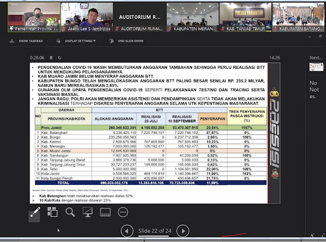 Selain itu Gubernur Jambi Al Haris juga menjelasakan tentang peta resiko, jumlah kasus covid-19, peta keterisian tempat tidur (BOR), capaian vaksinasi, dan penyaluran bantuan jaring pengaman sosial, dan aksi percepatan penanganan.